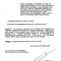 - Loi n° 2004-19 du 16 juillet 2004 portant autorisation de ratification des traités de l’organisation mondiale de la propriété intellectuelle (OMPI) sur le droit d’auteur Wipo Copyright Treaty (WCT) et du Traité de l'Organisation Mondiale de la Propriété Intellectuelle (OMPI) et sur les interprétations et exécutions et les phonogrammes "Wipo Performancers and phonograms Treaty" (WPPT) signés le 20 décembre 1996 à Génève (Suisse).