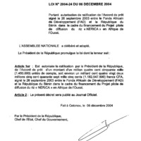 - Loi n° 2004-24 du 6 décembre 2004 portant autorisation de ratification de l’accord de prêt signé le 26 septembre 2003 entre le Fonds Africain de Développement (FAD) et la République du Bénin dans le cadre du financement du projet pilote de diffusion du riz « NERICA » en Afrique de l’Ouest.