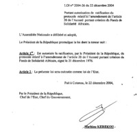 - Loi n° 2004-26 du 22 décembre 2004 portant autorisation de ratification du protocole relatif à l’amendement de l’article 20 de l’Accord portant création du Fonds de Solidarité Africain.