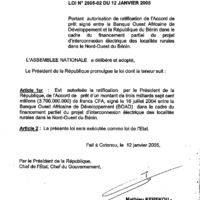 - Loi N° 2005-02 du 12 janvier 2005 portant autorisation de ratification de l’accord de prêt signé entre la Banque Ouest Africaine de Développement et la République de Bénin dans le cadre du financement partiel du projet d’interconnexion électrique des localités rurales dans le Nord-Ouest du Bénin.