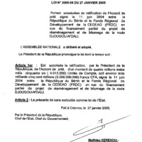 - Loi n° 2005-06 du 27 janvier 2005 portant autorisation de ratification de l’accord de prêt signé le 11 juin 2004 entre la République du Bénin et le Fonds Régional de Développement de la CEDEAO (FRDC) en vue du financement partiel du projet de réaménagement et de bitumage de la route Djougou-N’dali.