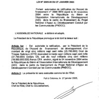 - Loi N° 2005-08 du 27 janvier 2005 portant autorisation de ratification de l’accord de financement n° 3990 BEN signé le 04 novembre 2004 entre l’Association Internationale de Développement (AID) et la République du Bénin dans le cadre du financement du projet national d’appui au développement conduit par les communautés (PNDCC).