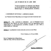 - Loi N° 2005-15 du 3 juin 2005 portant autorisation de ratification des statuts du centre africain pour les applications de la météorologie au développement (ACMAD).