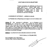 - Loi N° 2005-18 du 8 juillet 2005 portant autorisation de ratification de l’accord de crédit signé le 1er février 2005 entre la République du Bénin et le fonds nordique de développement (NDF) dans le cadre du financement complémentaire du projet de fourniture de services d’énergie