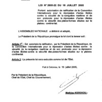 - Loi N° 2005-22 du 18 juillet 2005 portant autorisation de ratification de la convention pour la répression d’actes illicites contre la sécurité de la navigation maritime et de son protocole pour la répression d’actes illicites contre la sécurité des plates-formes fixes situées sur le plateau continental