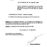 - Loi N° 2005-23 du 18 juillet 2005 portant autorisation de ratification de la convention internationale sur la formation des gens de mer, de délivrance de brevets et de veille, telle que modifiée en 1995.