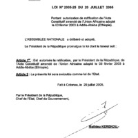 - Loi n° 2005-25 du 20 juillet 2005 portant autorisation de ratification de l’acte constitutif amendé de l’union africaine adopté le 03 février 2003 Addis-Abeba (Ethiopie).