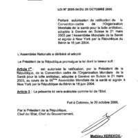- Loi N° 2005-34 du 20 octobre 2005 portant autorisation de ratification de la Convention cadre de l’Organisation Mondiale de la Santé pour la lutte antitabac, adoptée à Genève en Suisse le 21 mars 2003 par l’Assemblée Mondiale de la Santé et signée à New York par la République du Bénin le 18 juin 2004