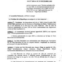 - Loi N° 2005-41 du 22 décembre 2005 portant suspension, pour l’élection présidentielle de mars 2006, du recensement électoral national approfondi institué par la loi n° 2005-14 du 28 juillet 2005 portant règles générales pour les élections en République du Bénin.