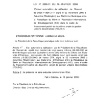 - Loi N° 2006-01 du 16 janvier 2006 portant autorisation de ratification de l’accord de crédit n° BEN 3117 signé le 03 novembre 2005 à Columbia (Washington) aux Etats-Unis d’Amérique entre la République du Bénin et l’Association Internationale de Développement (AID) dans le cadre du financement du deuxième projet de gestion urbaine décentralisée (PGUD2).