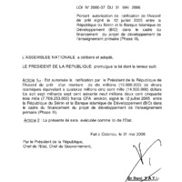 - Loi N° 2006-07 du 31 mai 2006 portant autorisation de ratification de l’accord de prêt signé le 12 juillet 2005 entre la République du Bénin et la Banque Islamique de Développement (BID) dans le cadre du financement du projet de Développement de l’Enseignement Primaire (Phase III).