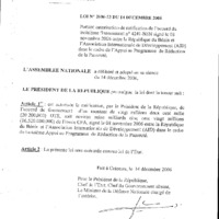 - Loi N° 2006-23 du 14 décembre 2006 portant autorisation de ratification de l’accord du troisième financement n° 4241-BEN signé le 08 novembre 2006 entre la République du Bénin et l’Association Internationale de Développement (AID) dans le cadre de l’appui au programme de réduction de la pauvreté