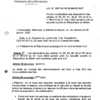 - Loi N° 2007-02 du 29 janvier 2007 portant modification des dispositions des articles 10, 89, 93, 95 et 101 de la loi n° 98-019 du 21 mars 2003 portant code de sécurité sociale en République du Bénin