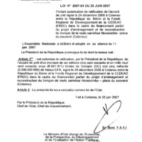 - Loi N° 2007-04 du 25 juin 2007 portant autorisation de ratification de l’accord de prêt signé le 24 décembre 2006 à Cotonou entre la République du Bénin et le Fonds Régional de Développement de la CEDEAO (FRDC) dans le cadre du financement partiel du projet d’aménagement et de reconstruction du tronçon de route carrefour Akossombo-place du Souvenir (Cotonou).