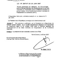 - Loi N° 2007-07 du 26 juin 2007 portant autorisation de ratification de l’accord signé entre la Banque Islamique de Développement et les Etats membres de l’Organisation de la Conférence Islamique et portant création de la Société Internationale Islamique de Financement du Commerce (SIFC).