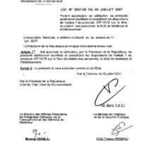 - Loi N° 2007-09 du 5 juillet 2007 portant autorisation de ratification du protocole additionnel modifiant et complétant les dispositions de l’article 7 du protocole A/P1/5/79 sur la libre circulation des personnes, le droit de résidence et d’établissement.