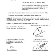 - Loi N° 2007-16 du 27 juillet 2007 portant autorisation de ratification de la convention sur la protection et la promotion de la diversité des expressions culturelles adoptée à Paris le 20 octobre 2005.