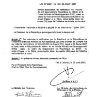 - Loi N° 2007-19 du 9 août 2007 portant autorisation de ratification de l’accord de prêt signé entre la République du Bénin et le Fonds Africain de Développement (FAD) dans le cadre du financement du projet d’appui à la filière coton.