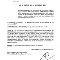 - Loi N° 2007-23 du 24 juillet 2007 portant autorisation de ratification de l’accord d’Istisna'a entre la République du Bénin et la Banque Islamique de Développement (BID) dans le cadre du financement partiel du projet de protection contre l’érosion côtière dans la ville de Cotonou et la Commune de Sèmè-Kpodji