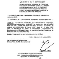 - Loi N° 2007-26 du 8 octobre 2007 portant autorisation de ratification de l’accord de financement n°4339 BEN signé le 13 juillet 2007 entre la République du Bénin et l’Association internationale de Développement (AID) dans le cadre du quatrième appui au programme de réduction de la pauvreté (PRSC-IV).