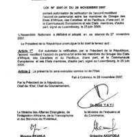 - Loi N° 2007-31 du 28 novembre 2007 portant autorisation de ratification de l’accord modifiant l’accord de partenariat entre les membres du groupe des Etats d’Afrique, des Caraïbes et du Pacifique, d’une part et la communauté européenne et ses Etats membres d’autre part, signé le 25 juin 2005 au Luxembourg