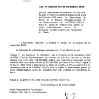 - Loi N° 2008-06 du 6 octobre 2008 portant autorisation de ratification de l’accord de prêt signé entre la République du Bénin et la Banque d’Investissement et de Développement de la CEDEAO (BIDC) dans le cadre du financement partiel du projet d’électrification rurale de cinquante huit (58) localités en République du Bénin