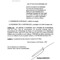 - Loi n° 99-012 du 05 février 1999 portant autorisation de ratification du protocole d'accord entre le gouvernement de la République du Bénin et le gouvernement de la République populaire de Chine signé le 07 juillet 1995 dans le cadre de la fourniture d'un crédit d'assistance militaire par la Chine au Bénin