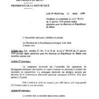 - Loi n° 99-015 du 12 mars 1999 modifiant et complétant la Loi n° 98-034 du 15 janvier 1999 portant règles générales pour les élections en République du Bénin