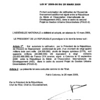 - Loi N° 2009-06 du 25 mars 2009 portant autorisation de ratification de l’accord de financement additionnel signé entre la République du Bénin et l’Association Internationale de Développement (AID) dans le cadre du second projet de projet urbaine décentralisée (PBGUD-2).