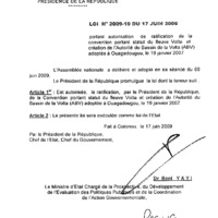 - Loi N° 2009-19 du 17 juin 2009 portant autorisation de ratification de la convention portant Statut du fleuve Volta et création de l’Autorité du bassin de la Volta (ABV) adoptée à Ouagadougou, le 19 janvier 2007.