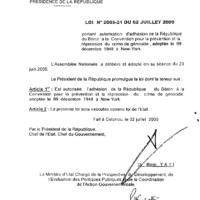 - Loi N° 2009-21 du 2 août 2009 portant autorisation d’adhésion à la convention sur la prévention et la répression du crime de génocide adoptée, le 09 décembre 1948 à New York.