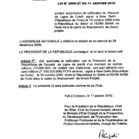 - Loi N° 2009-27 du 11 janvier 2010 portant autorisation de ratification de l’accord de ligne de crédit signé entre la République du Bénin et l’EXIM BANK de l’Inde dans le cadre du financement de divers projets.