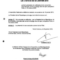 - Loi N° 2010-04 du 26 janvier 2010 portant autorisation de ratification de la convention internationale contre le dopage dans le sport, adoptée à Paris le 19 octobre 2005
