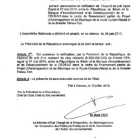 Loi N° 2010-29 du 13 juillet 2010 portant autorisation de ratification de l’Accord de prêt signé le 07 mai 2010 entre la République du Bénin et la Banque d’Investissement et de Développement de la CEDEAO dans le cadre du financement partiel du Projet d’Aménagement et de Bitumage de la route Ouidah-Allada et de la bretelle Pahou-Tori