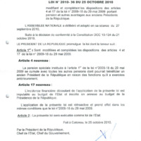 - Loi N° 2010-36 du 25 octobre 2010 modifiant et complétant les dispositions des articles 4 et 17 de la loi n°2009-18 du 29 mai 2009 portant pension et autres avantages des anciens Présidents de la République.