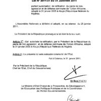 - Loi N° 2011-01 du 31 janvier 2011 portant autorisation de ratification du pacte de non-agression et de défense commune de l’Union Africaine, adopté le 31 janvier 2005 à Abuja (République Fédérale du Nigeria).