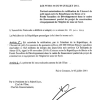 - Loi N° 2011-04 du 05 juillet 2011 portant autorisation de ratification de l’Accord de prêt signé entre la République du Bénin et le Fonds Saoudien de Développement (FSD) dans le cadre du financement partiel du projet de construction et équipement de l’hôpital de zone de Savè.