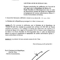 - Loi N° 2011-05 du 05 juillet 2011 portant autorisation de ratification de l’Accord de prêt signé entre la République du Bénin et le Fonds Saoudien de Développement (FSD) dans le cadre du financement partiel du projet de construction et équipement de centres universitaires (phase I, Centre Universitaire de Kétou).