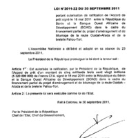 - Loi N° 2011-22 du 30 septembre 2011 portant autorisation de ratification de l’Accord de prêt signé le 18 mai 2011 entre la République du Bénin et la Banque ouest Africaine de Développement (BOAD) dans le cadre du financement partiel du projet d’aménagement et de bitumage de la route Ouidah-Allada et de la bretelle Pahou-Tori.