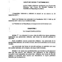 - Loi N° 2011-25 du 1er octobre 2011 portant règles générales applicables aux Personnels Militaires, des Forces de Sécurité Publique et Assimilés en République du Bénin.