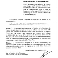 - Loi N° 2011-28 du 18 novembre 2011 portant autorisation de ratification de l’accord de prêt signé le 27 décembre 2010 entre la République du Bénin et le Fonds d’Abu Dhabi pour le Développement dans le cadre du financement partiel du projet d’aménagement et de bitumage de la route Ouidah-Allada et de la bretelle Pahou-Tori.