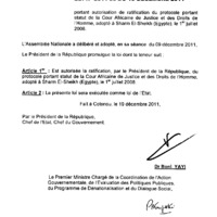 - Loi N° 2011-36 du 19 décembre 2011 portant autorisation de ratification du protocole portant Statut de la Cour Africaine de Justice et des Droits de l’Homme, adopté à Sharm EL-Sheikh (Egypte), le 1er juillet 2008.