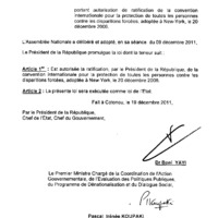 - Loi N° 2011-37 du 19 décembre 2011 portant autorisation de ratification de la convention internationale pour la protection de toutes les personnes contre les disparitions forcées, adoptée à New-York, le 20 décembre 2006