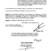 - Loi N° 2011-38 du 28 décembre 2011 portant autorisation de ratification de l’accord portant création de la commission mixte paritaire de délimitation de la frontière entre le Gouvernement de la République du Bénin et le Gouvernement de la République Fédérale du Nigeria, signé le 04 août 2006 à Abuja au Nigéria
