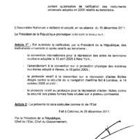 Loi N° 2011-39 du 28 décembre 2011 portant autorisation de ratification des instruments universels adoptés en 2005 relatifs au terrorisme.