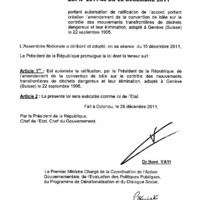 Loi N° 2011-40 du 28 décembre 2011 portant autorisation de ratification de l’amendement à la convention de Bâle sur le contrôle des mouvements transfrontières de déchets dangereux et leur élimination, adopté à Genève (Suisse) le 22 septembre 1995.