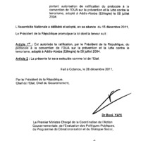 - Loi N° 2011-42 du 28 décembre 2011 portant autorisation de ratification du protocole à la convention de l’OUA sur la prévention et la lutte contre le terrorisme, adopté à Addis-Abeba (Ethiopie) le 08 juillet 2004.