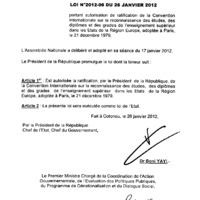 - Loi N° 2012-06 du 26 janvier 2012 portant autorisation de ratification de la Convention Internationale sur la reconnaissance des études, des diplômes et des grades de l’enseignement supérieur dans les Etats de la Région Europe, adoptée à Paris, le 21 décembre 1979.