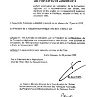 - Loi N° 2012-07 du 26 janvier 2012 portant autorisation de ratification de la Convention régionale sur la reconnaissance des études, des diplômes et des grades de l’enseignement supérieur en Asie et dans le Pacifique, adoptée à Paris, le 16 décembre 1983.