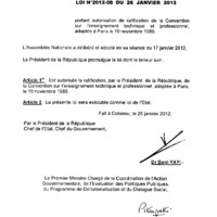 - Loi N° 2012-08 du 26 janvier 2012 portant autorisation de ratification de la Convention sur l’enseignement technique et professionnel, adoptée à Paris, le 10 novembre 1989.